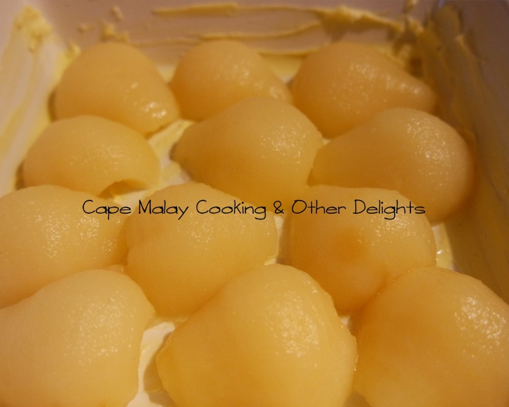 Arrange the pear halves in a greased oven proof dish