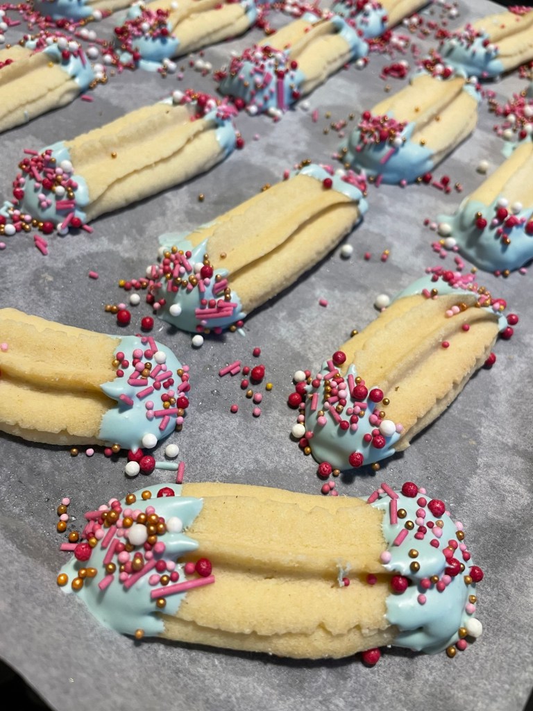 Cool on a cooling rack and dip the top of the biscuits in melted cooking chocolate.