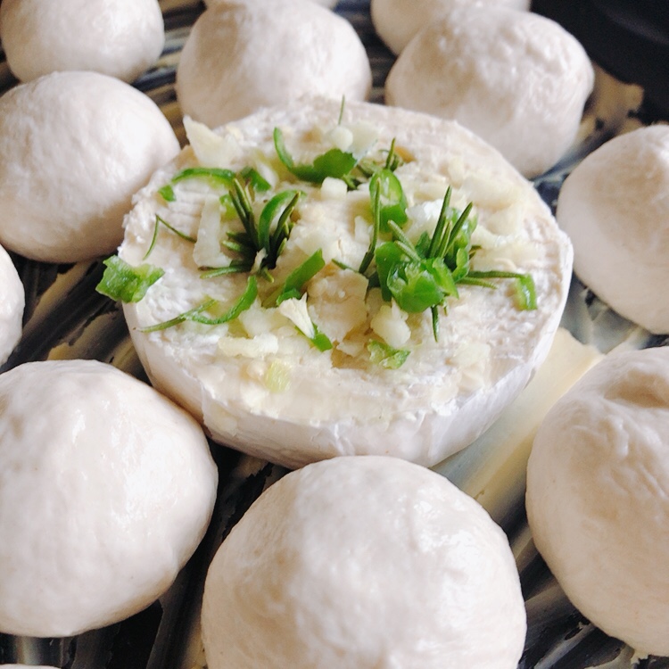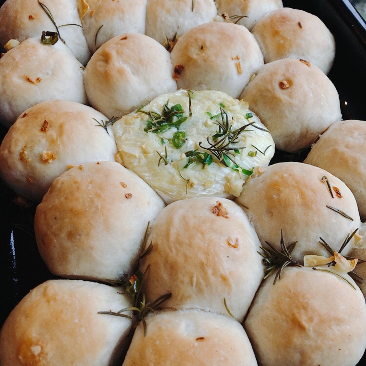 Soft garlic and herb enriched rolls, topped with olive oil, served with a whole Camembert. Tear pieces of rolls, dip in the melted cheese and enjoy.