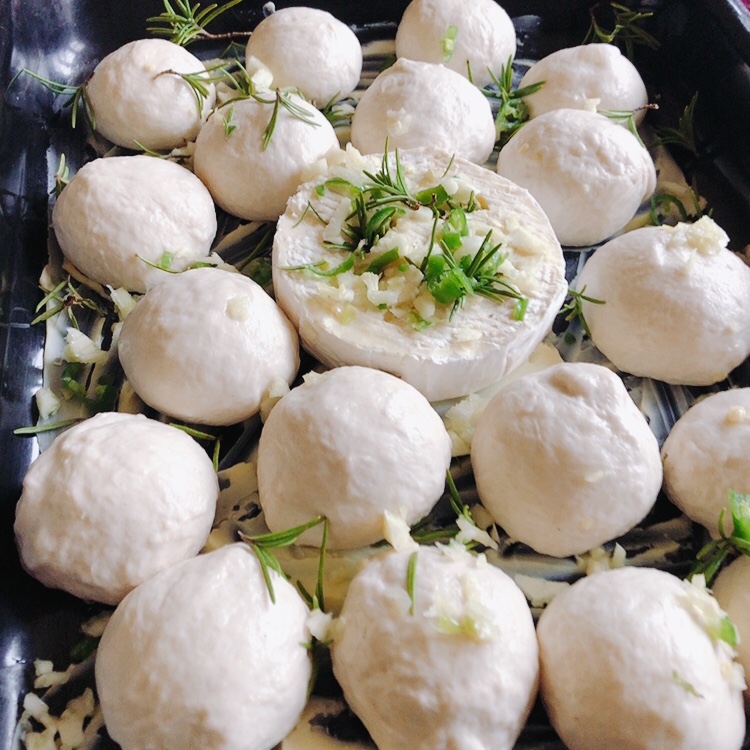 Divide the dough into small balls, arrange the dough balls around the cheese, leaving a bit of a space between in ball. Scatter the remainder of the garlic, chillies and rosemary over the rolls. Brush lightly with olive oil. Cover loosely with plastic and leave for to rise again for about an hour.