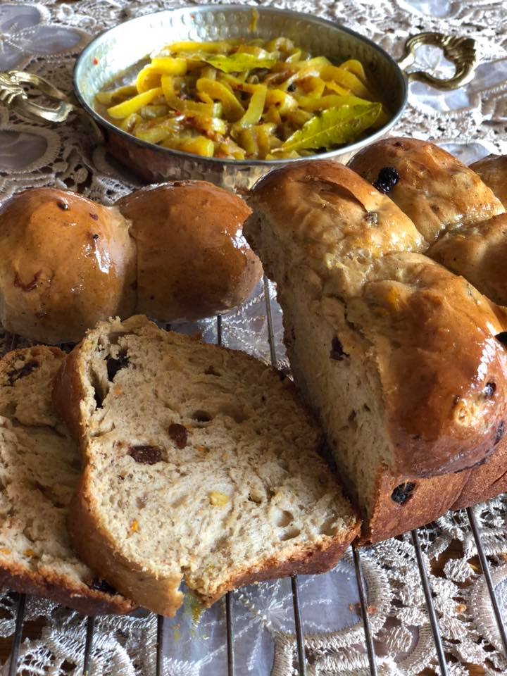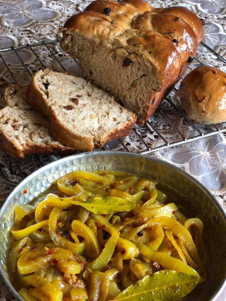 A treat when freshly baked and spread with butter, served with my Ingelegde Vis (pickled fish)