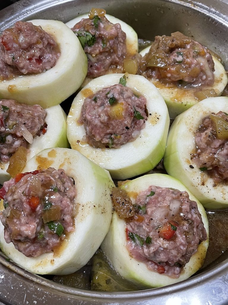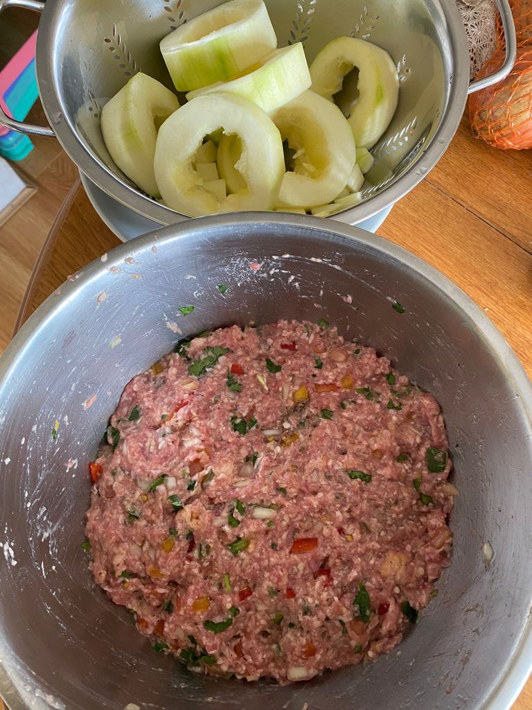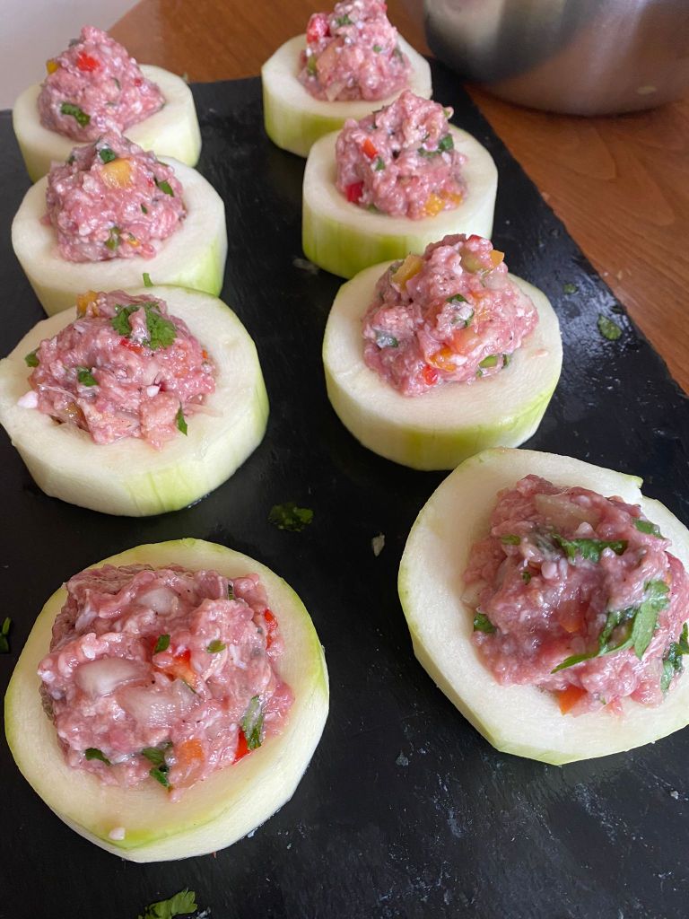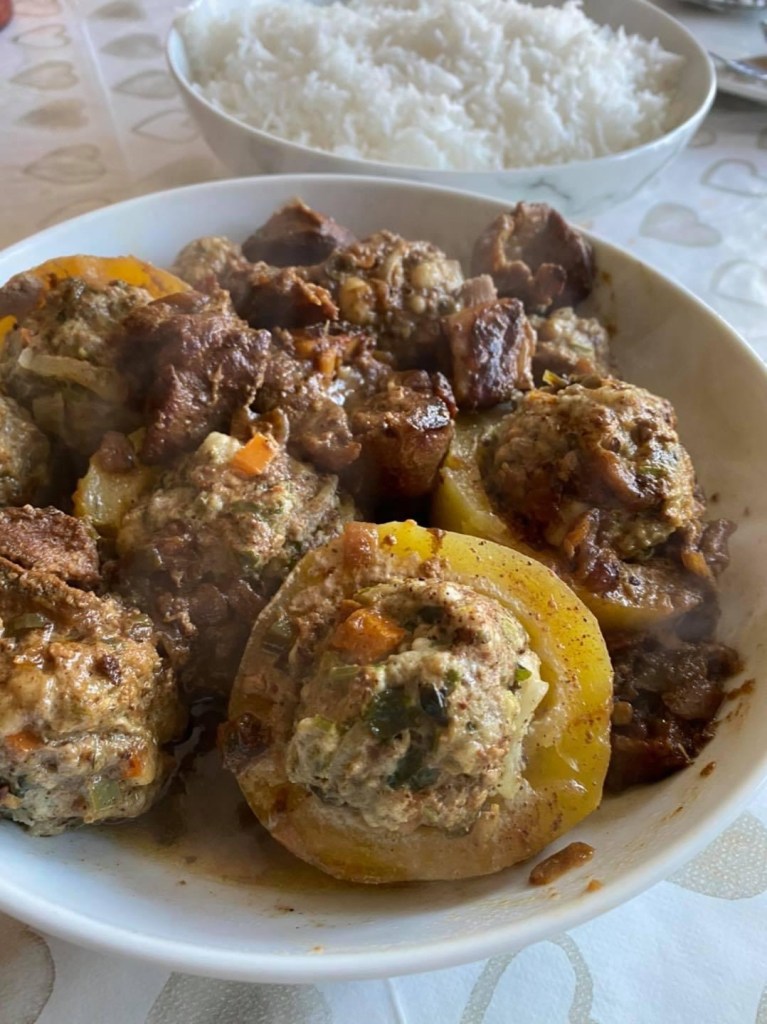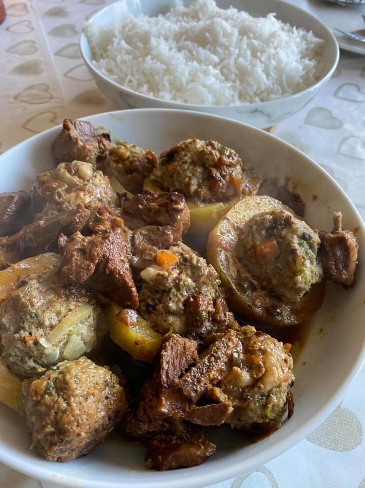 Meanwhile prepare your frikkadel. Place a small ball (40ml) of frikkadel mixture in the centre of each slice of marrow. Place the stuffed marrow on top of the mutton mixture, add 1 cup of water. Sprinkle with grated nutmeg, dot with small pieces of butter and steam covered for about 30 minutes on low – medium heat without stirring. (if you need to check on the food stick a wooden spoon gently inside and move slightly) Serve, with white rice and atchar.