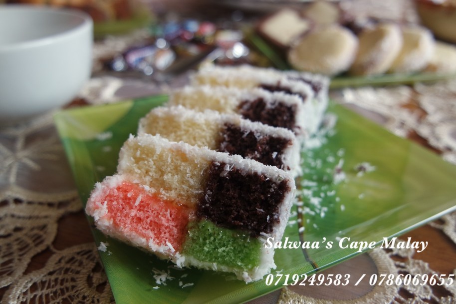 Check jam roll this is a quintessential Cape Malay recipe. One that adorned every cake table at a wedding, hujaaj, on the Eid/labarang table or any other social gathering. Check jam roll is also known as Battenberg Cake in England. This striking checkerboard cake is a favourite for afternoon tea in England. Legend has it that the cake was created in honour of the marriage of Queen Victoria’s granddaughter Victoria to Prince Louis of Battenberg in the 1880s. (The coloured squares inside are thought to represent the four princes of Battenberg) It’s quite possible that the English brought the recipe to South Africa and we’ve adapted the recipe to represent our colourful personalities as the original recipe was only yellow and pink in colour and covered with marzipan.