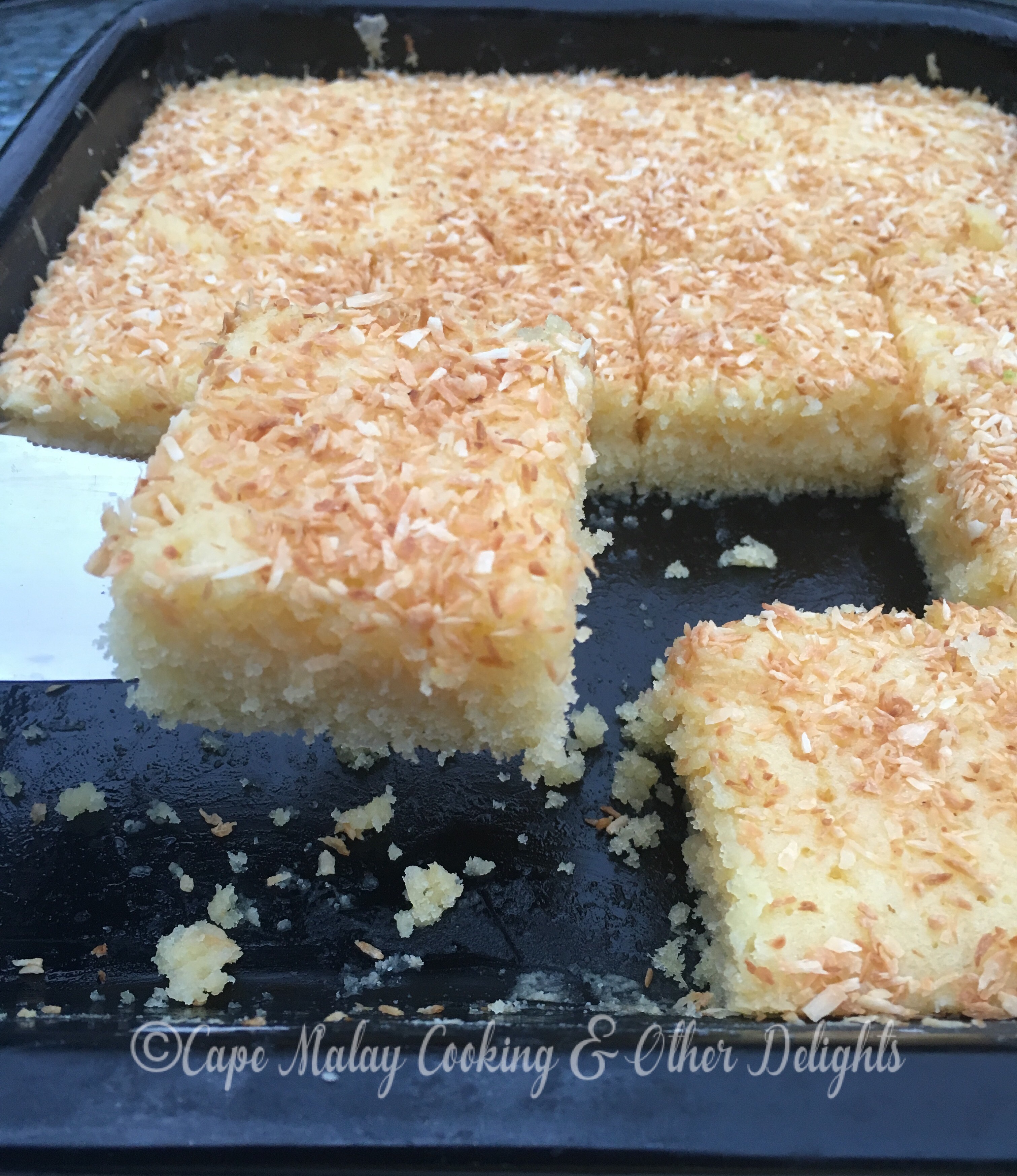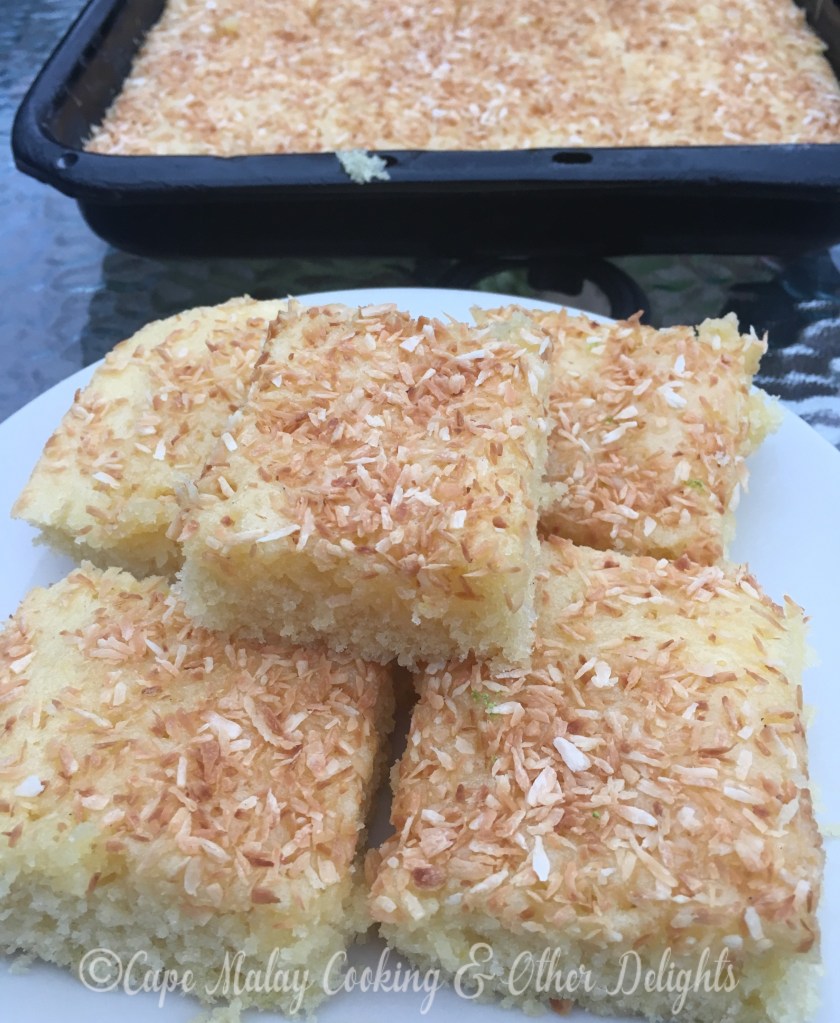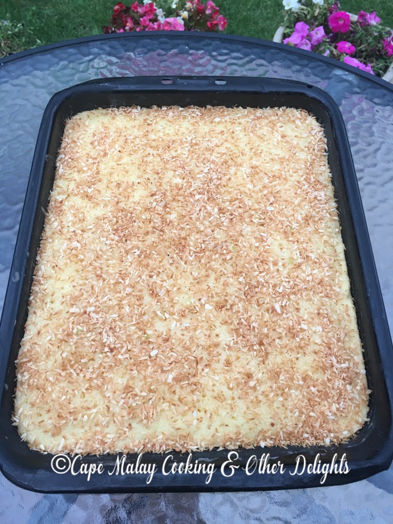 Whilst the cake is cooling in the tray mix together the castor sugar and juice of 2 lemons. Roast the coconut in a warm saucepan until lightly golden brown. Make slight holes all over the cake with a toothpick or a fork. Pour the castor sugar and lemon mixture over the warm cake. The liquid will soak into the cake. Sprinkle the roasted coconut over. Leave to cool completely before cutting into squares.