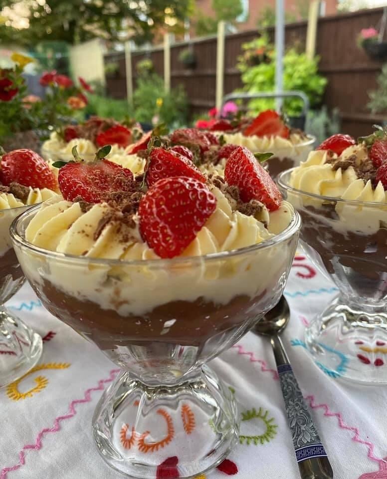 Garnish with fresh raspberries, strawberries or cherries. Grate chocolate over and enjoy. This trifle can also be made the day before. Make in individual bowls ready to be served.