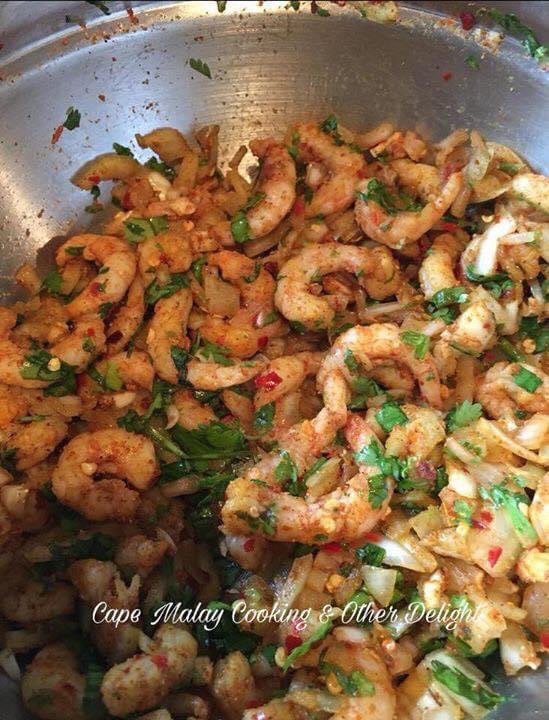 Usually samosas are made with spiced minced meat, chicken or vegetable ones with potato, peas, or mixed veg but do try them with prawns for a change. I used shrimps or small prawns for my recipe. This recipe can be used to fill samosas or spring rolls. I usually make my own samosas wrappers or pur. You’ll find my recipe on youtube.com/capemalaycooking