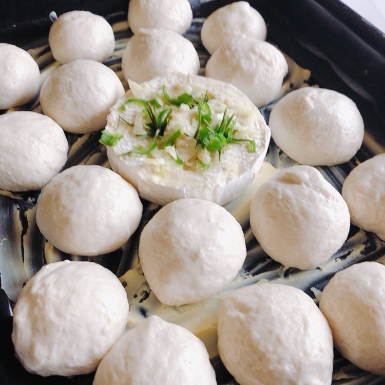 Divide the dough into small balls, arrange the dough balls around the cheese, leaving a bit of a space between in ball. Scatter the remainder of the garlic, chillies and rosemary over the rolls. Brush lightly with olive oil. Cover loosely with plastic and leave for to rise again for about an hour.