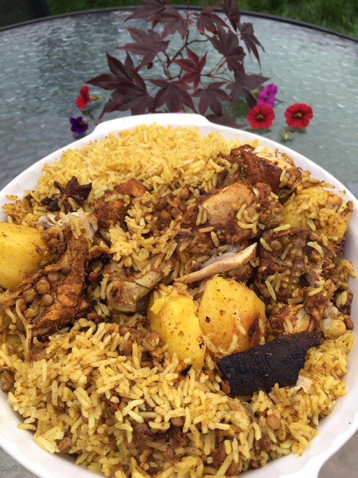 Biryani is a mixed rice dish originating from the Indian subcontinent. It is made with aromatic spices, rice, brown lentils and usually some type of meat, chicken or in some cases without any protein (meat). Usually fried potatoes and sometimes boiled eggs are added.