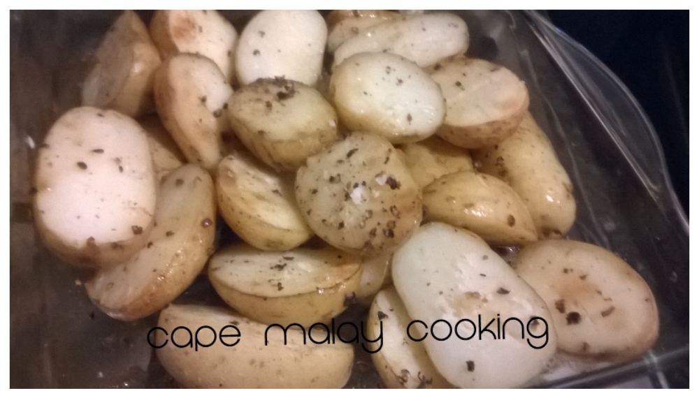 Wash and half, if necessary, 1 kg baby potatoes. Drain excess water. Add the potatoes in a roasting / Pyrex dish. Add salt and crushed black pepper to taste. Drizzle a tablespoon or two olive oil over the potatoes and add a quarter cup of water. Cover with foil. Pop in the oven an hour before the leg of lamb is done. The potatoes will turn out crispy on the outside and soft in the inside.